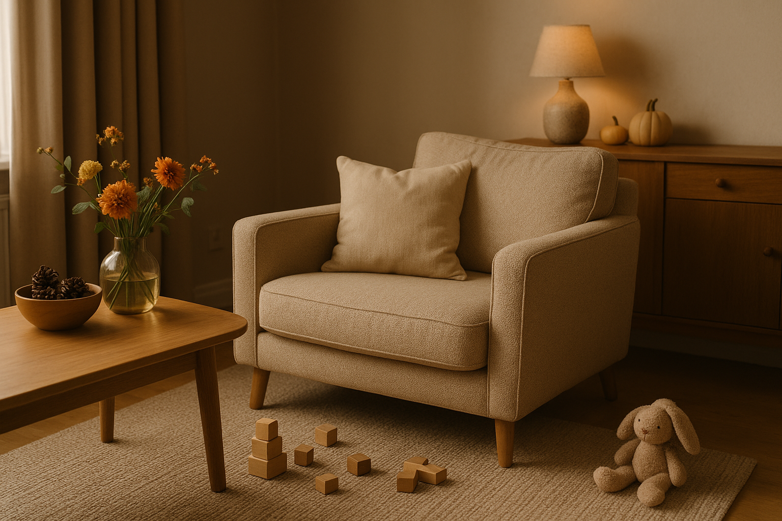 Zelfs de simpelste dingen maken een groot verschil. Een mand vol verzamelde bladeren en kastanjes van een boswandeling, een schaal met seizoensfruit (heerlijk om op te eten én decoratief!), of een paar robuuste kussens in herfstkleuren op de bank. Het voegt warmte en sfeer toe, verbindt je met het buitenleven, en het allerbelangrijkste: het past bij een levendig gezinsleven zonder dat je bang hoeft te zijn voor elk voorwerp. Zo creëer je een huis dat meegroeit met de seizoenen, stijlvol én leefbaar.